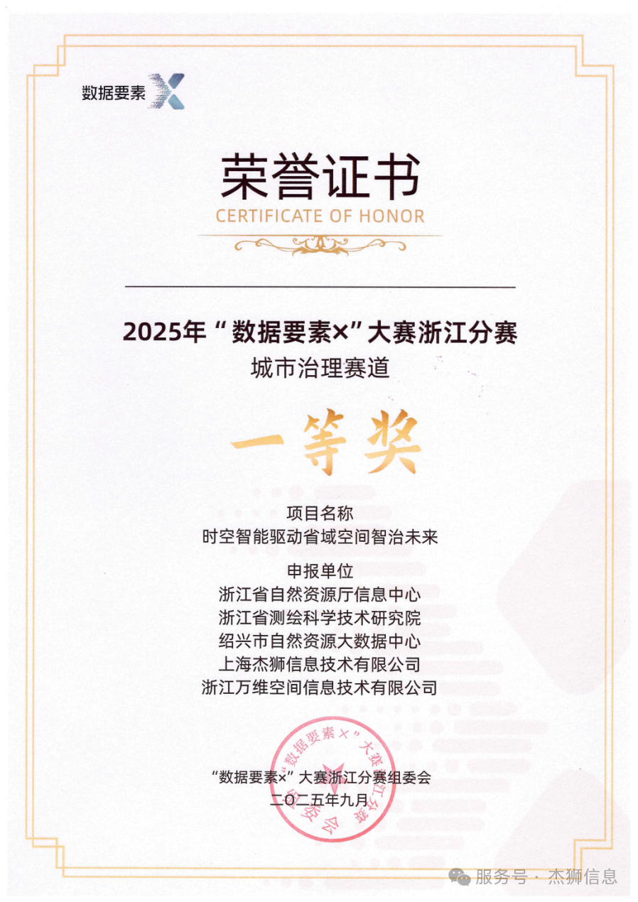 近日,2025年“数据要素×”大赛浙江分赛决赛圆满落幕。历经全省初赛、复赛多轮严苛选拔与激烈角逐,上海杰狮信息技术有限公司(以下简称“杰狮信息”)与浙江省自然资源厅信息中心等单位联合申报的“时空智能驱动省域空间智治未来”项目,凭借卓越的技术创新力与实践价值,在168支晋级决赛的优秀队伍中脱颖而出,斩获城市治理赛道一等奖,充分彰显了杰狮信息在时空数据治理与智慧应用领域的深厚技术积淀与行业服务能力。